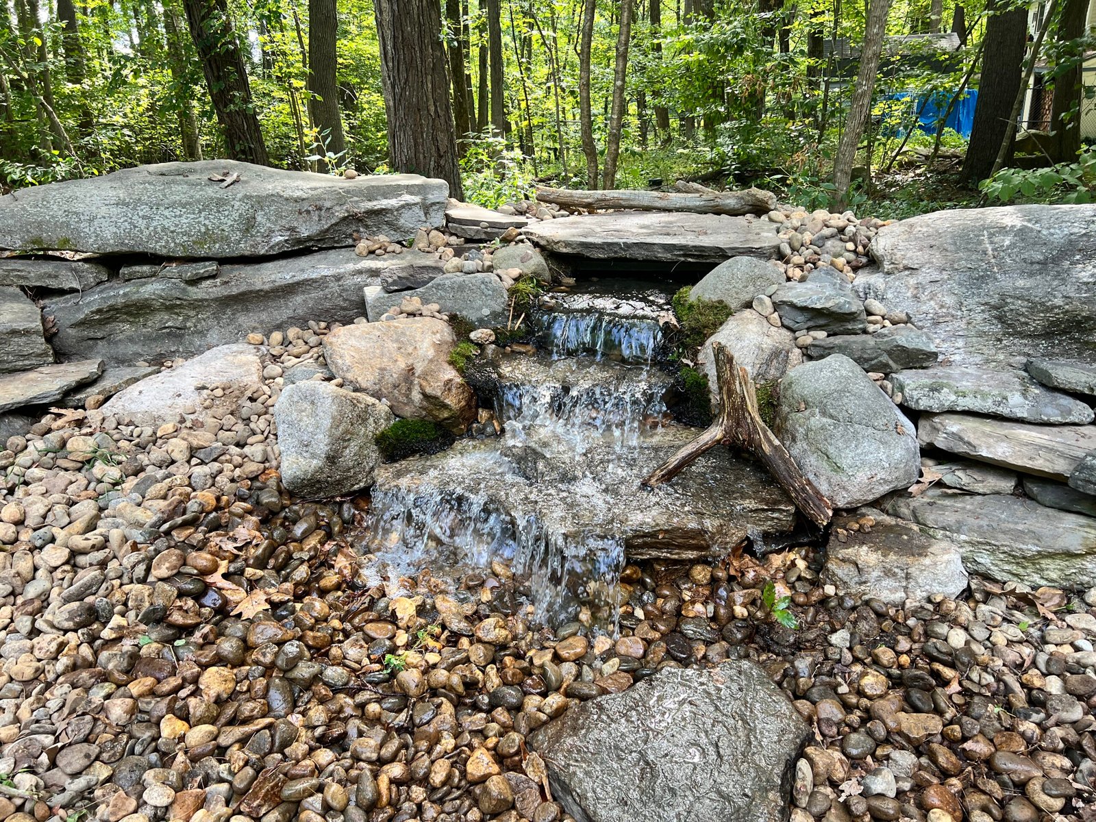 A Pondless waterfall consists of a EPDM lined watercourse, with carefully crafted falls and streams. We use local granite and gravel to recreate falls you would come across in nature. The systems name comes from the lack of a pond that recirculates the water. In a Pondless® we create a underground reservoir comprised of Aquablox®, and a pump vault. We disguise all of these mechanical components with rock work and plantings. Water is circulated to the top of the fall via a pump. Unlike a pond where running a pump is necessary for filtering and oxygenating water to support fish, a pondless can be safely shut off to conserve electricity when not being used.